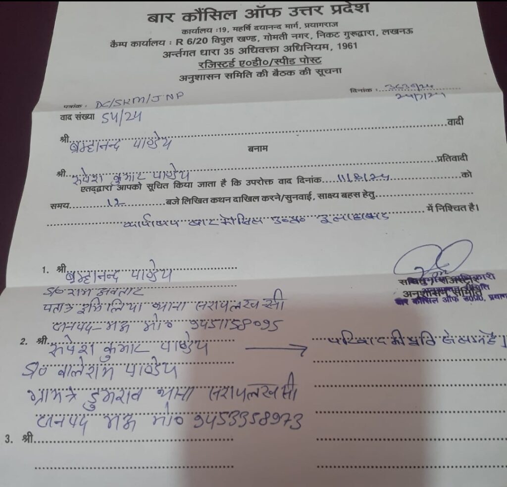 बिना क्लाइंट की सहमति लिए विपक्षी से मिलकर अधिवक्ता पर मुकदमा वापस लेने का है आरोप मऊ। विपक्षियों से मिलकर मुकदमे को वापस लेने वाले दीवानी कचहरी के अधिवक्ता रुपेश को बार कौंसिल उत्तर प्रदेश की अनुसाशन समिति ने तलब किया है। रुपेश कुमार पर विना अपने क्लाइंट की सहमति लिए उसके मुकदमे को वापस … Continue reading विपक्षी से मिलकर मुकदमा वापस लेने वाले अधिवक्ता रुपेश पाण्डेय को बार कौंसिल की अनुसाशन समिति ने किया तलब