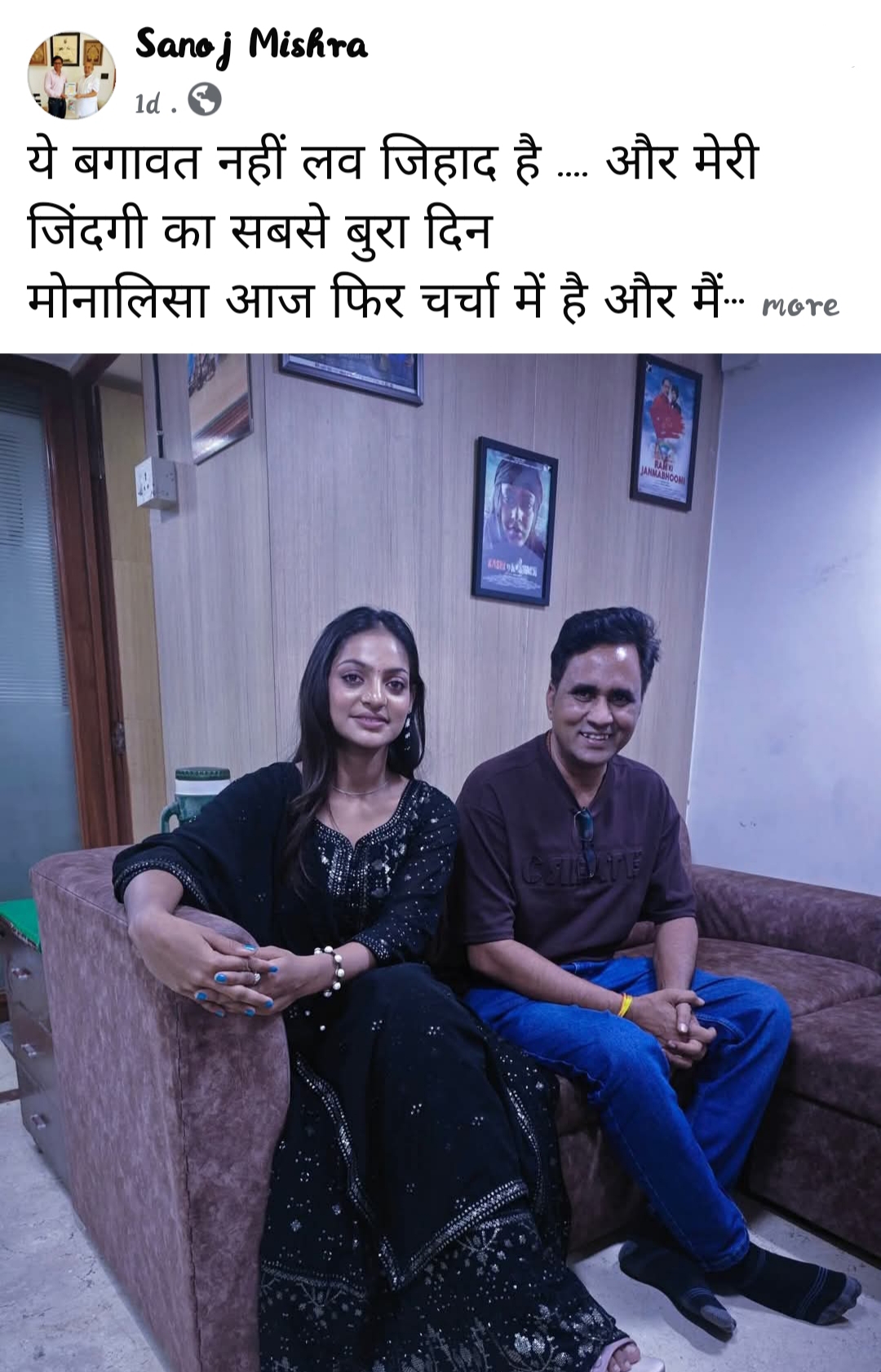 फिल्म निर्माता सनोज मिश्रा ने दावा किया है कि जिस युवती को उन्होंने प्रशिक्षण देकर फिल्म अभिनेत्री बनाने की पहल की थी, वह अब कथित तौर पर साजिश और लव जिहाद का शिकार हो गई है। महाकुंभ के दौरान मोनालिसा की सादगी और व्यक्तित्व से प्रभावित होकर उन्होंने उसे फिल्म में मौका देने का निर्णय लिया था। उनका कहना है कि उन्होंने उसे प्रशिक्षण देने और फिल्म निर्माण की तैयारी में बड़ा आर्थिक जोखिम उठाया तथा इस परियोजना के लिए करोड़ों रुपये का कर्ज भी लिया।
